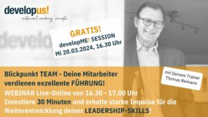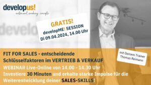 developus!So erreichst DuThomas Reimannund sein Team.developus! GmbHIm Böhel 3355450 Langenlonsheim +49 (0) 177 243 2505 +49 (0) 67 04 / 96 39 77 treimann@developus.de Linkedin Xing Meine letzte developME! Session am 09.04.2024 hatte das Thema: FIT FOR SALES – entscheidende Schlüsselfaktoren im Vertrieb & Verkauf! CROSS SELLING – wie kann ich aus meiner Kundenbeziehung mehr rausholen? Warum UPSELLING ganz viel mit meiner systematischen Bedarfsanalyse zu tun hat? KUNDENEINWÄNDE entkräften – meine Königsdisziplin im Verkaufsgespräch Mit Klick auf das Bild gelangst du zur Aufzeichnung: Meine developME! Session am 20.03.2024 hatte das Thema FOKUS FÜHRUNG: Blickpunkt TEAM – deine Mitarbeiter verdienen exzellente FÜHRUNG! Mit Klick auf das Bild gelangst du zur Aufzeichnung: